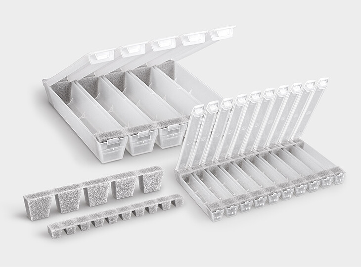 Novidade: Para proteger ainda mais suas torneiras, rebarbas e ferramentas de haste, agora estão disponíveis espumas conectadas adicionais para SplitPack® e FivePack. Isso significa que ferramentas sensíveis são suavemente incorporadas e, portanto, protegidas de maneira ideal, mesmo sob fortes influências de transporte.